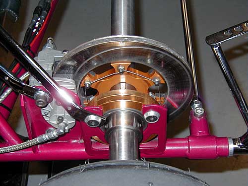 This photo shows the Jolly Kart brake detail, a dual-piston, vented-rotor, disk-brake system. Notice the quality of the parts. These are not play toys!