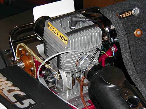 The HPV (Horstman Piston Valve) 2-cycle engine has 100cc swept volume and turns 14,000 RPM developing 9.5 HP. This engine is built by Woltjer Engines and is engine is used by all age groups. Classes for older drivers allow larger carbs and exhaust pipes. In the top class this HPV engine will rev to 17,000 rpm and produce 20 HP. Note the black box on the carb. This is an intake silencer. Half the noise from a two-stroke engine comes from the intake. The inlet silencer is required by WKA. The clutch is a dry single-plate centrifugal clutch that locks up at about 6,000 rpm. It works like a Top Fuel dragster clutch.
